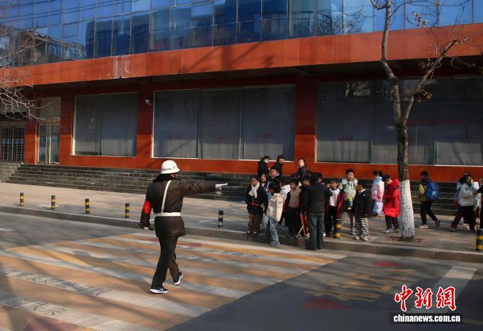 图为上教顶峰时段寻视职员护收教死脱止黑色斑马线。 弛楠 摄
